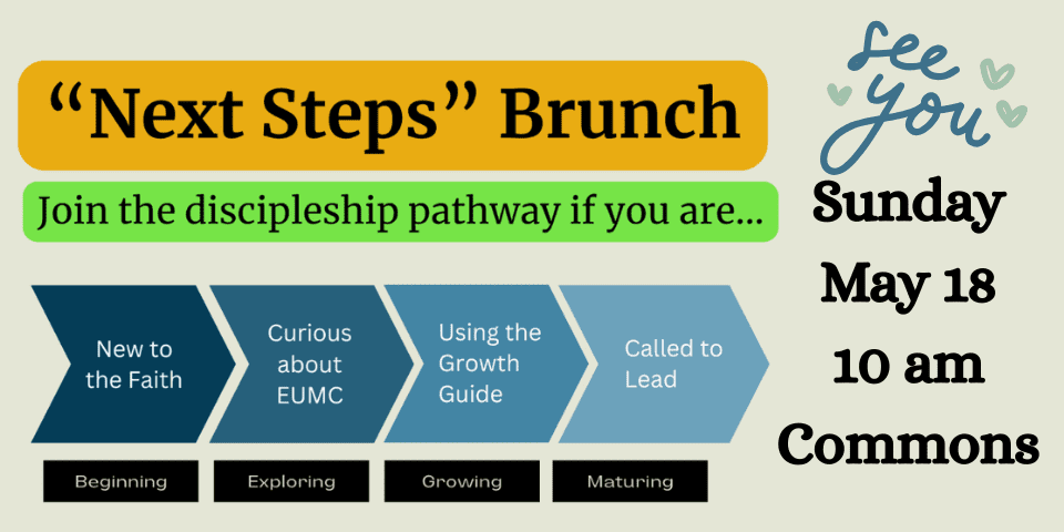 Join us for our “Next Steps” Brunch on Saturday, May 18th at 10:00am during the Discipleship Hour in The Commons. This is a great opportunity to learn practical steps on the discipleship pathway and discover how to grow alongside others.