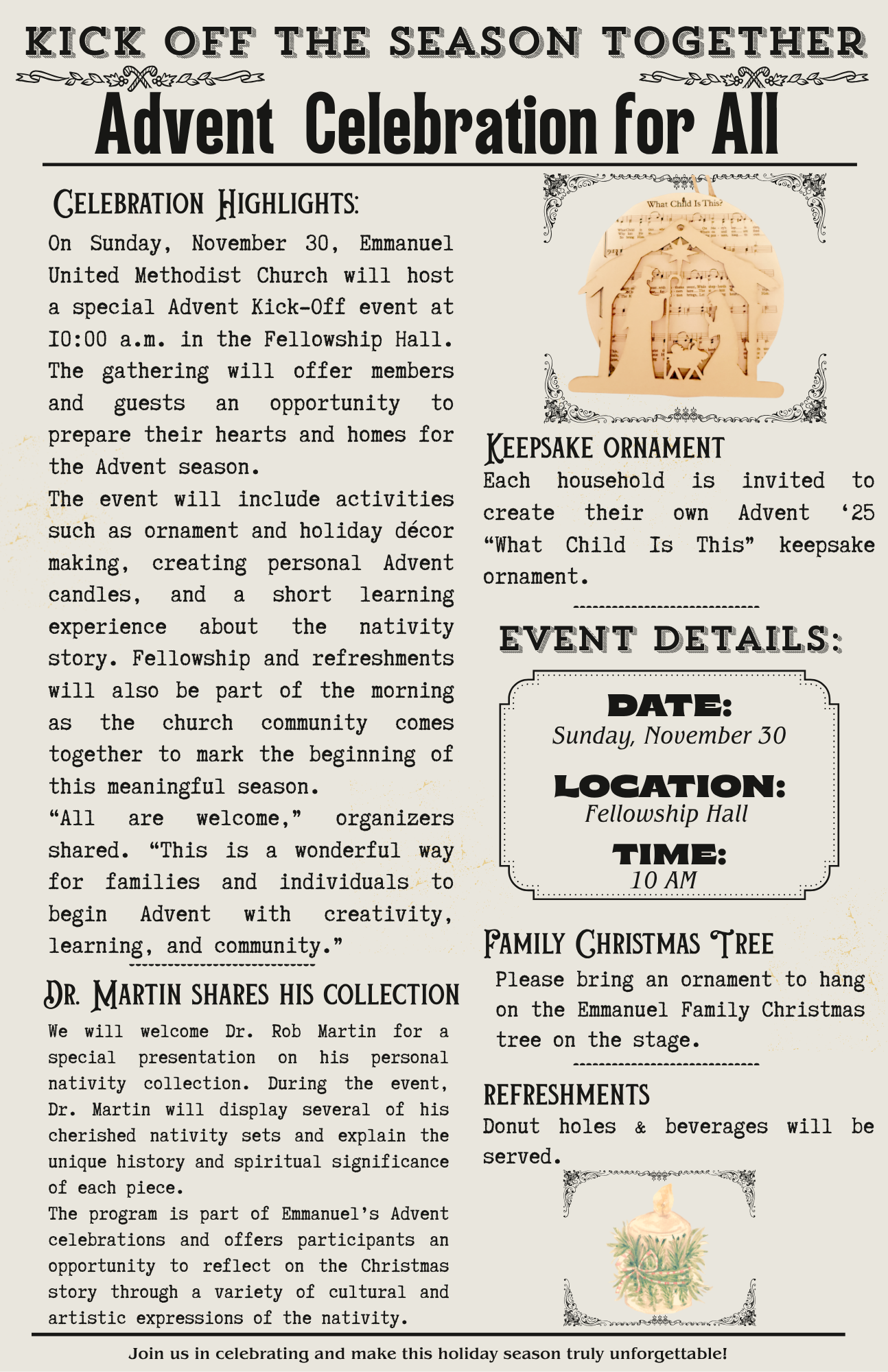 Join us as we kick off our Advent Worship Series, “What Child Is This?” with a morning full of joy, creativity, and fellowship!