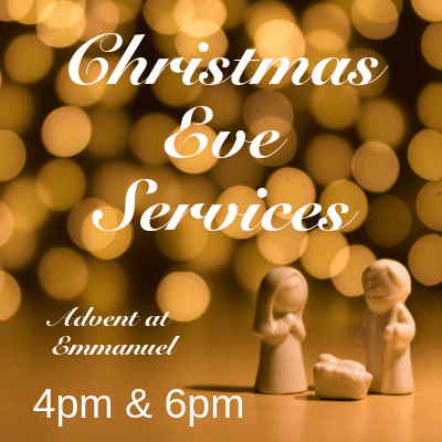 Christmas Eve Candlelight and Communion Services December 24, 2018 4pm & 6pm Emmanuel United Methodist Church We will have two services on Christmas Eve. Our Candlelight and Communion Services are at 4pm and 6pm. All are invited and welcome!