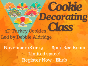 Cookie Decorating is Back and it is 3D! We will make turkeys that stand up. Come learn from expert Debbie Aldridge how to make beautiful cookies – step by step. It’s easier than it looks!