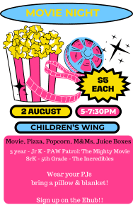 We will serve Pizza, Popcorn, M&Ms, & juice boxes. Get comfy by wearing your PJs and bringing a blanket and pillow. Meet downstairs in the Children’s Wing.