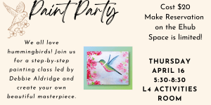 Paint Party! Thursday, April 16 – come learn step by step how to paint this beautiful humming bird.