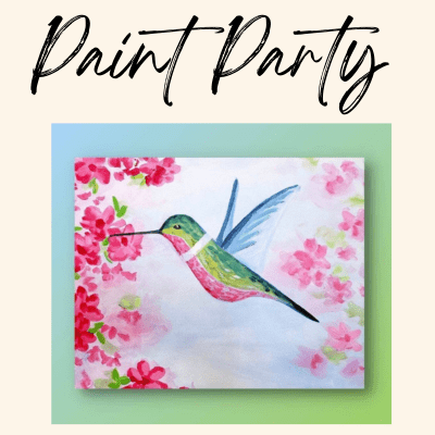 Paint Party! Thursday, April 16 – come learn step by step how to paint this beautiful humming bird.