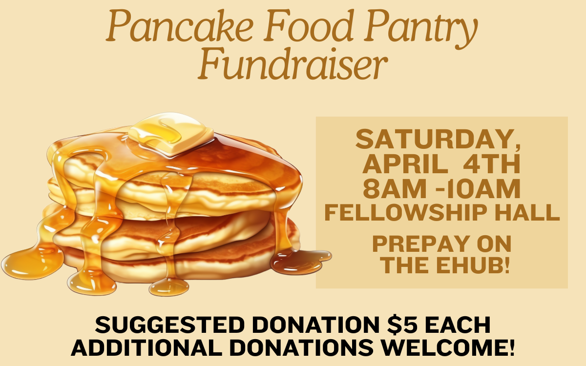 Join us on Saturday, April 4, from 8:00–10:00 a.m. in the Fellowship Hall for a delicious breakfast and a great cause.