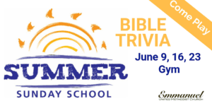 All Adult and Youth are invited to our combined Summer Sunday School Bible Trivia during June. We will meet in the gym from 9:45 to 10:30 on June 9, 16, & 23.