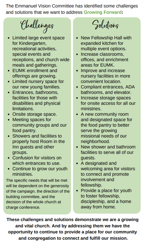 We are excited to announce that Emmanuel UMC will soon be Growing Forward in our journey to share Christ’s Love with those around us.