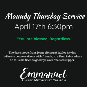 Join us for a remembrance of the Last Supper as we have Holy Communion on April 17 at 6:30pm in the Sanctuary.