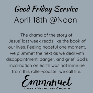 We will gather at Noon on April 18, in the Sanctuary for a Good Friday service.