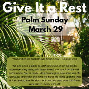 The commandment to keep the sabbath is one that might not seem as important as the one about not murdering. But, as we give witness yet again to the story of Jesus’ entrance into Jerusalem—proclaiming justice for the oppressed—we must also proclaim justice and peace …and rest…for the weary of this world.